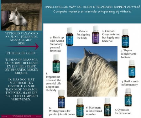 🌱Bij de Raindrop Therapie worden therapeutische zuivere essentiële oliën door middel van een specifieke techniek toegepast op het paard.